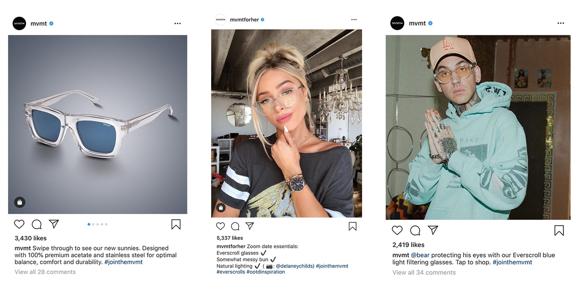 Another way to increase engagement on your posts is to tag accounts in your caption that your company is collaborating with (in that specific post), especially if the account is a popular influencer people will recognize. Anything that strikes a chord of familiarity with a follower will increase their chances of spending more time interacting with your post. A great example of this are the MVMT posts. In one post they tag Blackbear (@bear), a popular musician and influencer, and in another they tag a photographer who took the photo. People being able to relate to your posts is your best chance of getting them to engage. If you can find a way to be funny in your caption while staying on brand, your analytics will thank you for it. Don’t be afraid to be clever - people will appreciate references or jokes about things they understand. This is why memes have gone wild with the younger generation. Relatability is the best way to connect with your audience, and since people under 30 make up the vast majority of daily social media users, tailor your captions in a way that will appeal to them.